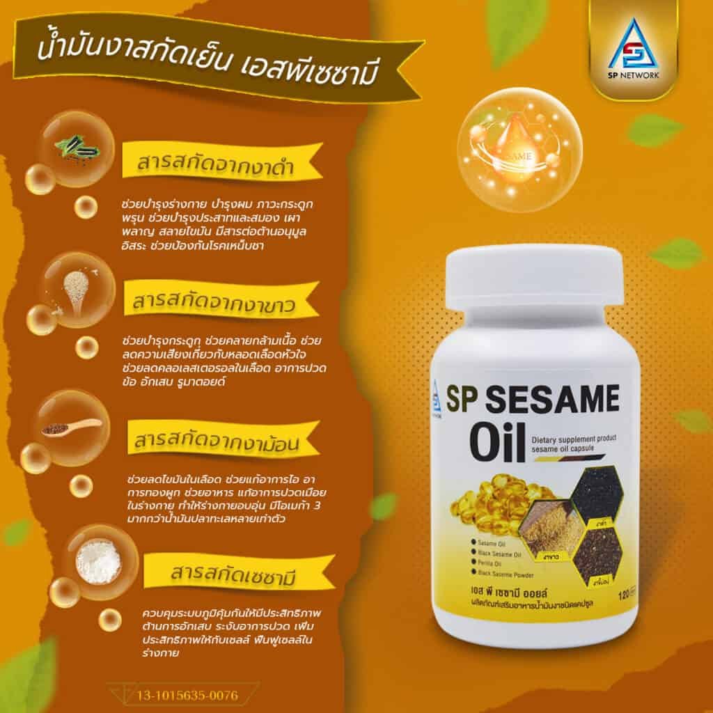 สารสกัดเพื่อสุขภาพ จากงาดำ งาขาว งาม้อน เซซามีน ลดอาการปวดข้อเข่า เพิ่มแคลเซียมให้กระดูก บำรุงสมอง ลดการเกิดอัลไซเมอร์ เอส พี เซซามี ออยล์ มีสารสกัดของแมกนีเซียม ช่วยดูแลการทำงานของหัวใจ ดูแลระบบประสาทและกล้ามเนื้อ